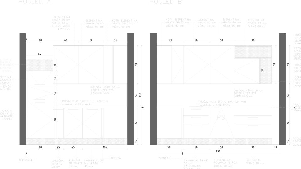 Tlorise v merilu (tloris premikov in rušitev sten, tloris pohištva, tloris tlakov, tloris razsvetljave, tloris mikrolokacije elektrike...)